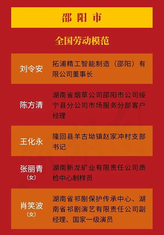 全國勞動模范(邵陽5人)全國先進工作者(邵陽1人)
